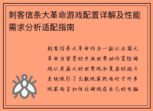 刺客信条大革命游戏配置详解及性能需求分析适配指南