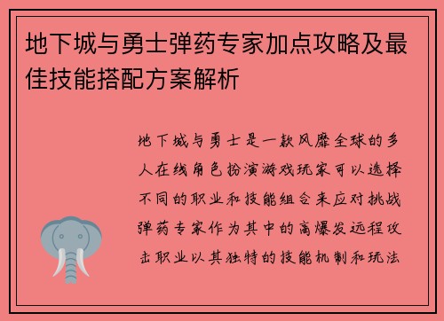 地下城与勇士弹药专家加点攻略及最佳技能搭配方案解析